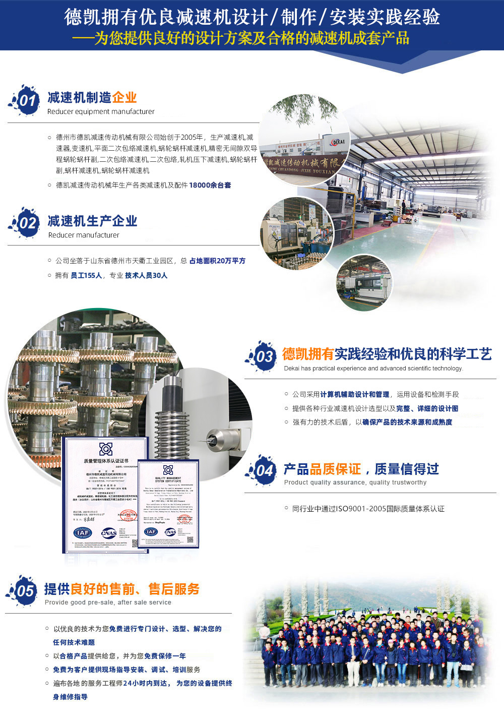 德州市德凱減速傳動(dòng)機(jī)械有限公司,生產(chǎn)減速機(jī),減速器,變速機(jī),平面二次包絡(luò)減速機(jī),蝸輪蝸桿減速機(jī),精密無間隙雙導(dǎo)程蝸輪蝸桿副,二次包絡(luò)減速機(jī),蝸輪蝸桿,軋機(jī)壓下減速機(jī),蝸輪蝸桿副,蝸桿減速機(jī),蝸輪蝸桿減速機(jī),公司占地面積20萬平方,員工155人,技術(shù)人員30人,年生產(chǎn)各類減速機(jī)及配件18000余臺(tái)套。在同行業(yè)中通過了ISO9001質(zhì)量管理體系認(rèn)證。公司設(shè)備齊全、技術(shù)力量強(qiáng)大、檢測(cè)手段完善,引進(jìn)國外大型數(shù)控二次包絡(luò)機(jī)床GJK75加工數(shù)控4臺(tái),可加工到800二次包絡(luò)蝸輪蝸桿。引進(jìn)漢江S7732蝸桿磨床3臺(tái),精度可達(dá)5級(jí)。公司擁有輝光離子氮化爐4臺(tái),經(jīng)該設(shè)備氮化后可提高蝸桿表面硬度、耐磨性高、提高疲勞強(qiáng)度、變形量小、耐蝕性、...